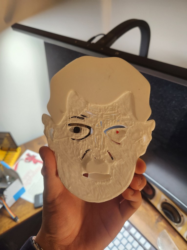Originated because a English Honors class project after reading 1984, this Big Brothers’s face is driven by a servo and rotates toward any human face detected by the camera on the ESP32 camera. I got an A on the project:)