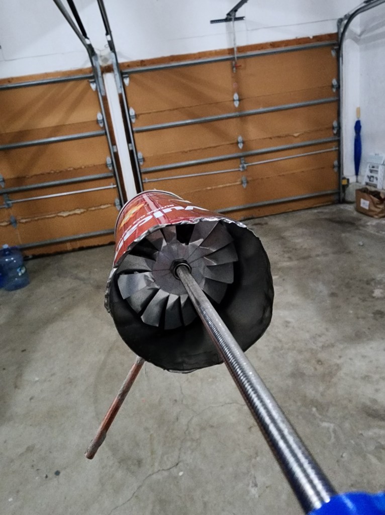 This time its a APUSH project. I was doing a research on regulation in aircrafts. I created this butane powered turbine engine by making fan blades out of soda cants. The blades blew up as expected because there was no motion balance at all. Maybe I will try that again when I have a CNC.
